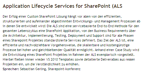 Ich freue mich, diese Jahr als Sprecher auf der SharePoint Konferenz sein zu dürfen, nachdem ich im letzten Jahr als Besucher dort und von der Themenvielfalt begeistert war. Ich werde eine Session zum Thema Application Lifecycle Services halt, s.u. Ich würde mich freuen, wenn viele Teilnehmer zu der Session kommen würden.